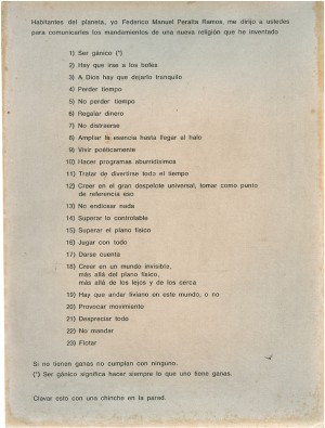 También hacia fines de la década del 60 creó una religión: la gánica. Ser gánico apela a hacer siempre lo que uno tiene ganas de hacer. Así lo demuestran los 23 mandamientos publicados por el artista y repartido entre sus amistades.