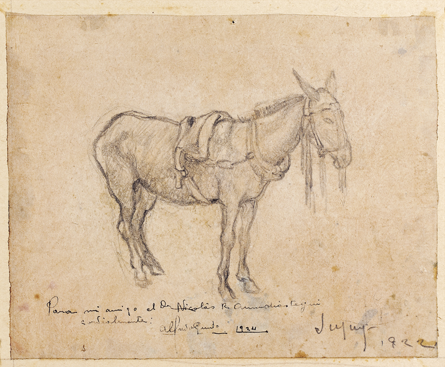 Mula con arneses, fechado en Jujuy en 1922, es un estudio realizado durante un viaje por el noroeste argentino y el altiplano boliviano, en el que Guido registró paisajes, arquitectura, tipos, indumentaria y escenas de costumbres locales con un marcado interés por la recuperación de las raíces americanas. Las imágenes obtenidas le permitieron crear una serie de 27 grabados con el tema del altiplano boliviano que hoy forma parte de la colección del museo Castagnino y que fue exhibida en la galería Witcomb en 1923. Desde la década del 20 fue una constante en la producción artística de Guido la búsqueda de un carácter típico hispanoamericano.Mula con arneses es un boceto realizado a lápiz de un animal de carga típico de la zona cordillerana argentina. Su representación y estudio no son ajenos al rescate de la argentinidad llevado a cabo por la corriente nacionalista de los años 20 y 30, que planteaba los temas costumbristas y tradicionalistas como fundantes de una estética de la identidad nacional y regional.