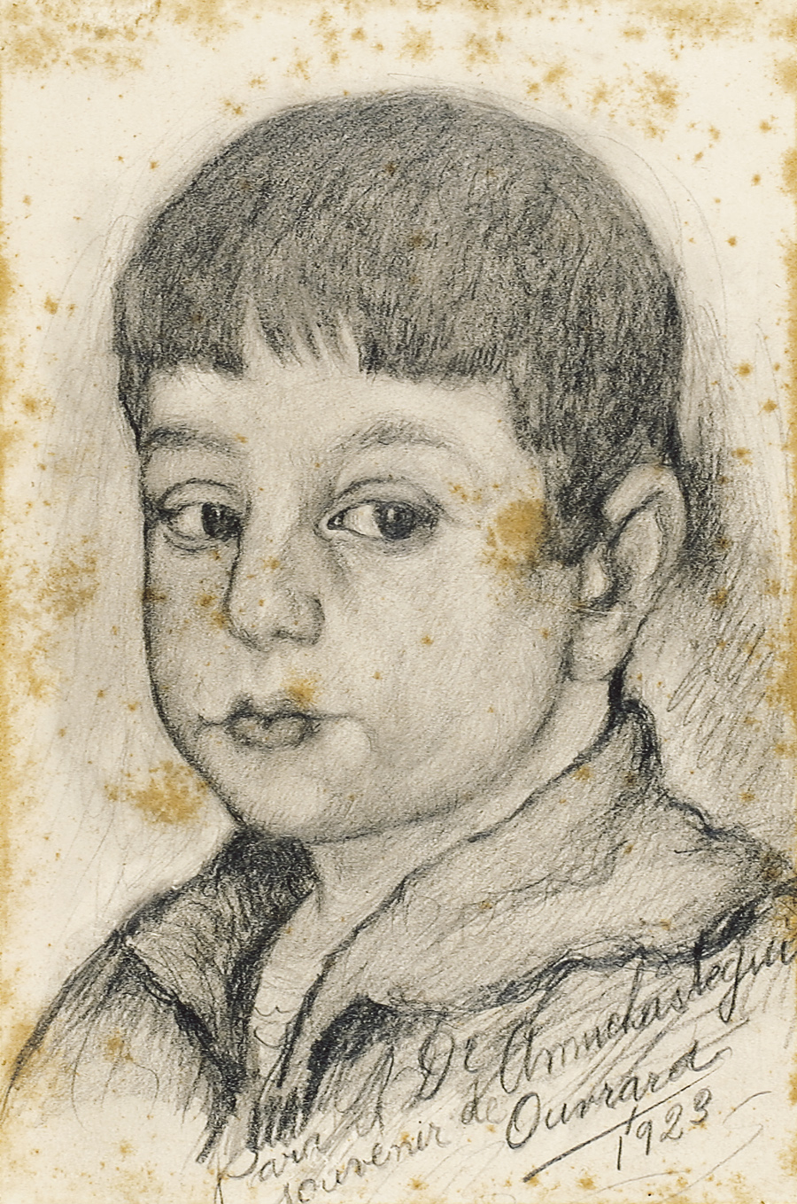 El museo Castagnino conserva dos dibujos de su autoría que originariamente formaron parte de dos colecciones privadas. Cabeza de niño(1929) formó parte del acervo de la familia Amuchástegui, como lo atestigua la dedicatoria al pie. El Dr. Nicolás Amuchástegui estuvo fuertemente ligado a la vida cultural de la ciudad, actuando como promotor de las instituciones iniciales. Entre éstas, de la Comisión de Bellas Artes, un emprendimiento de un grupo de particulares que tuvo a su cargo la organización del ‘Salón de Otoño’ que inauguraría en mayo de 1917. Este emprendimiento resultó tan exitoso que el intendente de Rosario, Federico Remonda Mingrand, decidió crear en julio de aquel año una Comisión Municipal de Bellas Artes, que tendría a su cargo las gestiones necesarias para la fundación del primer Museo dedicado a las Artes de la ciudad. El mismo quedaría inaugurado casi tres años más tarde, el 15 de enero de 1920, en un inmueble de la calle Santa Fe al 835[6]. Amuchástegui integró dicha Comisión, e incluso la presidiría en varias ocasiones, hasta finalizar el año 1928, cuando se retiró de la misma. En general, las piezas donadas al MMBAJBC por Amuchástegui son a la vez registro de la relación que éste sostuvo con los artistas, ya que en su mayoría le fueron dedicadas o se trata de retratos de sus familiares[7]. Cabeza de niño, es un grafito sugerente en el que Ouvrard ha insistido en los contornos, esforzándose por capturar la expresión del niño. El énfasis puesto en la mirada es comparable con aquel del que hizo uso en varias de sus pinturas. Tal es el caso del óleo - también parte del acervo del MMBAJBC- Nocturno (1922) donde imperan asimismo los tonos violáceos que serán tan comunes a su producción posterior. Ciertamente este dibujo pertenece a una etapa temprana en la producción del pintor, quien más tarde se dedicaría casi por completo a la realización de paisajes en los abundan los tonos violáceos. .