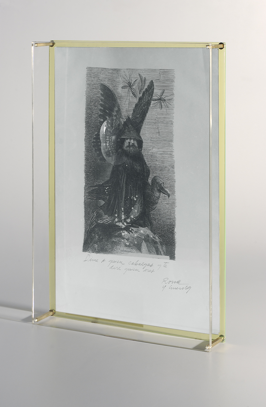 Primer aniversario yDime a quién cabalgas y te diré quién eres fueron firmados y fechados en un lapso de 20 días, entre el 13 de diciembre de 1968 y el 4 de enero de 1969, en un momento de fecunda producción. Como en otras obras de la serie - Los peligros de la soledad I, del 18 de noviembre de 1968 y especialmente en Los primeros juegos, del 14 de diciembre de 1968, o Quien le habrá metido ideas tan locas en su cabeza, del 3 de enero de 1969, realizados apenas con un día de diferencia de los que nos ocupan[3]-, utiliza la técnica surrealista del montage estableciendo asociaciones entre ilustraciones decimonónicas para libros y figuras construidas con líneas a la pluma, a las que distorsiona con ojos de aumento de acrílico situados en las cajas del mismo material que las contienen, destacando algunos detalles. Se trata de obras de pequeño formato, proyectos que “[…] apelan a lo anticuado y a lo extraordinario”[4], y que estructura creando alteraciones de sentido apelando a lo irreal, a lo fantástico y a la ironía, sumergiéndose en su vocación de dibujante y exhibiendo su oficio con la pluma.