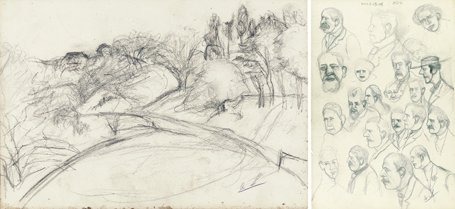 Ciertamente mucho más libre y expresivo es otro conjunto de bosquejos que el rosarino denominó “dibujos al ocio”, y en las cuales realizó un registro caricaturesco de distintos personajes. Tal es el caso de sin título (1914, Reg. No. 2533), en el que Schiavoni ha representado a un joven de pie, vistiendo una levita con los faldones abiertos y separados por delante. Si bien esta obra parece haber sido realizada en tono hilarante,  podemos despejar todas las dudas acerca de la intención jocosa del artista en aquellas otras en las que, con factura rápida, sumaria y burlesca, Schiavoni buscó captar  en pocos trazos el aspecto general de distintos personajes. Como en  sin título(Reg. No. 2512), muchas veces las figuras se encuentran superpuestas y no respetan una orientación definitiva del soporte. Pero este dibujo destaca del conjunto pues hay en él una imagen que bien podría ser un presuroso retrato de Costetti, llevando el mismo sombrero que en la fotografía conservada en el Archivo Schiavoni del MMBAJBC. Más aún, en el reverso de este dibujo Schiavoni realizaría, seguramente muchos años más tarde, uno de los pocos bocetos, si no el único, que se conservan de sus obras definitivas. En este caso es clara la relación que existe entre el paisaje anotado sucintamente y el óleo Arroyo de 1929.