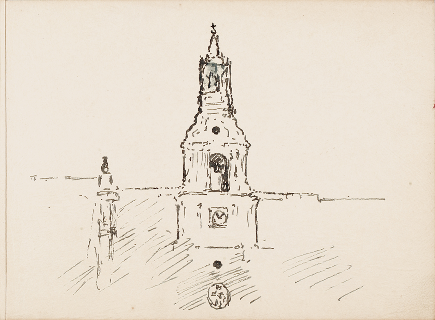 El paisaje es probablemente el género mas cultivado por Victorica a lo largo de su carrera (1). Las vistas obtenidas en ciudades europeas, americanas y del interior del país, realizadas con un estilo abocetado pero con una profunda capacidad de expresión, son el fruto del estímulo de los viajes que despiertan su imaginación y sensibilidad (2). Unos pocos años antes de su muerte, Victorica realizó dos viajes fuera del país que dejaron huella en su producción: en 1952 recorrió Bolivia y Perú y en 1953 regresó a Italia. Cartas con dibujos de paisajes de La Paz enviadas desde esta ciudad en enero de 1952 (3) anteceden la realización de un cuaderno de viaje en Arequipa, hoy en la colección del Museo Castagnino. Probablemente adquirido en alguna de las ciudades visitadas, el cuaderno posee dos tapas de cuero grabado con imágenes tradicionales y folclóricas y conserva nueve dibujos fechados entre fines de enero y principios de febrero de 1952. En una de las tapas se hallaba adherida una etiqueta de la galería Witcomb, que en el reverso posee el precio de base del lote -7500 pesos- que corresponde al remate de la sucesión.