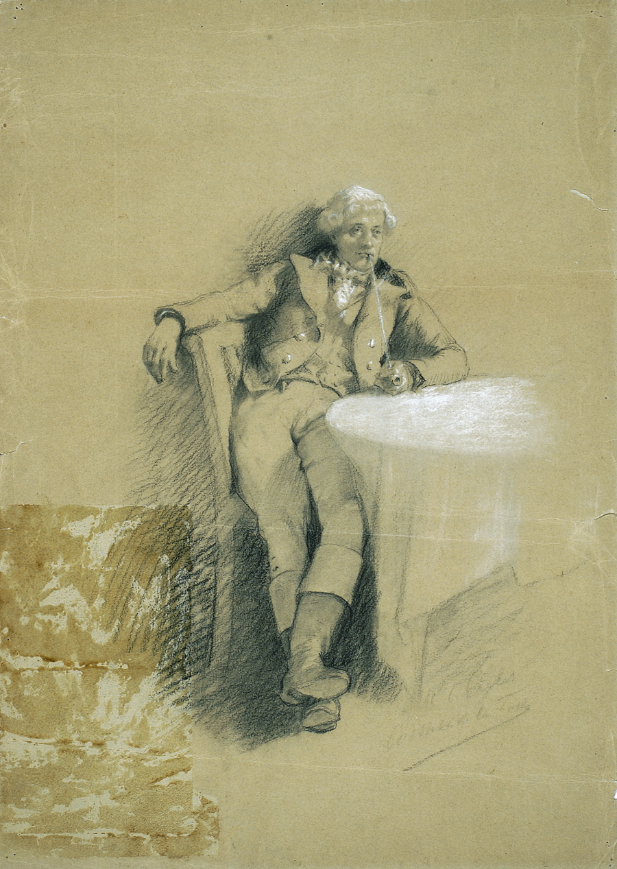 Figura representa una figura masculina ataviada al estilo del siglo XVIII que, en una pose distendida fuma en una pipa a la moda oriental. Resuelto a la carbonilla e iluminado con toques de blanco, el artista se centra en la expresión del retratado, en su rostro y en el torso, detallando los pliegues del saco y la textura de la camisa mientras que la imagen pierde precisión hacia los bordes, donde la línea se hace más suelta y abocetada.