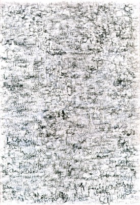 En estos lineamientos se halla esta obra, junto con otras dos —Sin título (2007) y Blasfemias (2008)— que forma parte de la etapa en la que el artista retomó el trabajo con las escrituras dibujadas en la década del 90. Luego de los fragmentos bíblicos y de poemas de diversos autores escritos sobre maniquíes (1994) y de sus escrituras en braille sobre desnudos fotográficos y estampas de Utamaro (1997), devinieron propuestas como esta.