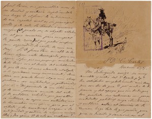 Los dibujos que nos ocupan, también deben interpretarse en relación con este conjunto que explora el espíritu popular hispano. Con una línea precisa describe el movimiento de una pareja de jinetes y de un personaje a caballo aislado e inmóvil; en ambos detalla las características de las vestimentas y las monturas en composiciones rápidas y espontáneas que realiza en el mismo papel-soporte del cuerpo del documento que los incluye. Aparecen en los registros del museo titulados como Figuras ecuestres, acompañando una carta del artista fechada en septiembre de 1897 y dirigida al donante, Dr. Carlos Carlés quien fuera Director de Correos y Telégrafos de la República Argentina hacia 1898. En la carta, Galofre elogia un proyecto de ley referido a la propiedad artística y literaria que gestiona Carlés, de quien vale destacar sus propósitos a 10 años de la Convention de Berne pour la protection des œuvres littéraires et artistiques, convocada por iniciativa de Victor Hugo. Nuestro artista tambiénagradece el interés demostrado por su obra España -que aparentemente desarrolla en ese momento- y comenta la próxima visita de una persona que trasladaría un cuadro suyo con el fin de exhibirlo en las ciudades americanas por las que viajaría. Curiosamente en noviembre de ese mismo año Baldomero Galofre integra una exposición en el salón Witcomb organizada por el marchand español José Artal. El mismo organizador realizó sucesivas exposiciones de arte español que incluyeron obras de Galofre en 1899, 1900 y 1901, y en 1902 montó una exposición homenaje al artista catalán en el mismo salón, en el marco de una empeñada valorización del arte hispano que cobraría mayor ímpetu en las primeras décadas del siglo XX.