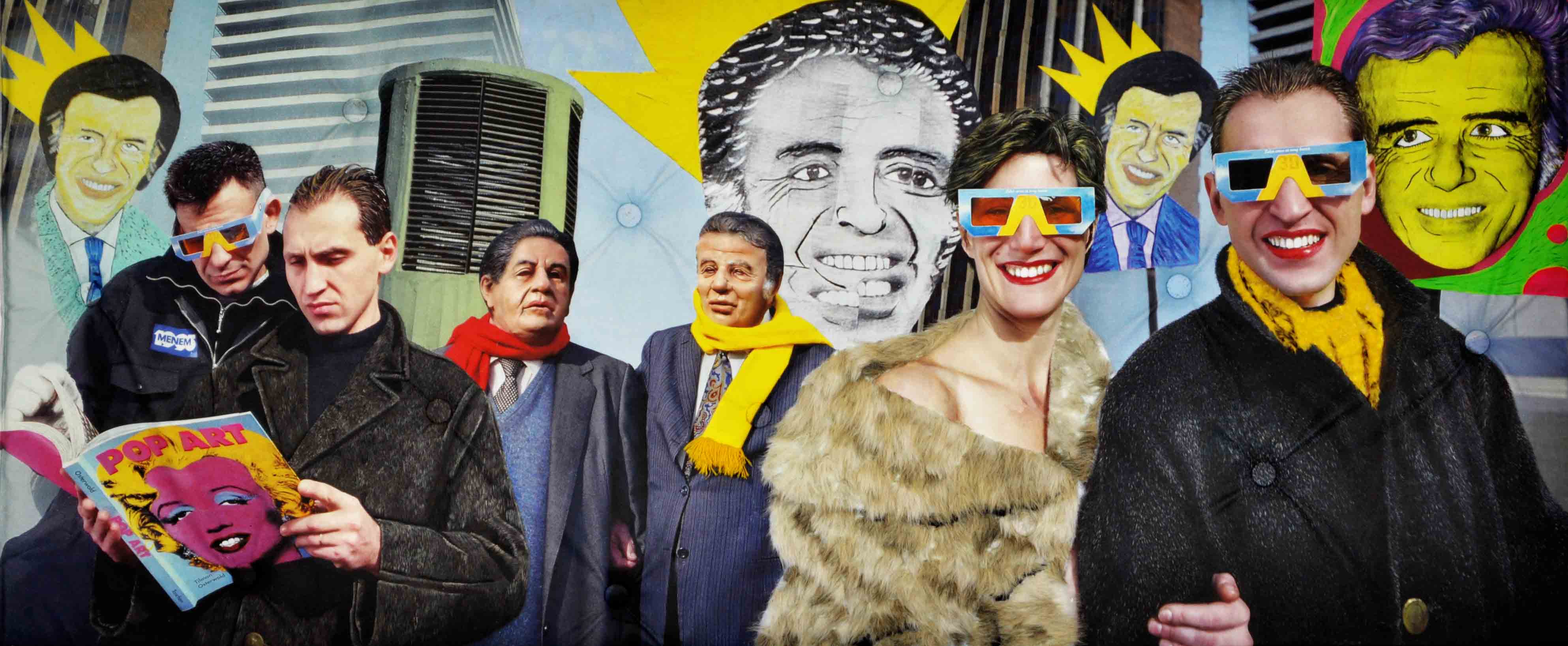 Esta obra fue realizada a partir de dos fotografías de Marcos López realizadas en 1993: La ciudad de la alegría y Los creativos de la agencia. En ellas aparecen personajes reconocibles de la plástica argentina como: Roberto Fernández, Martín Kovenski y Dalila Puzzovio junto a otros de la política nacional de los noventa en Argentina.