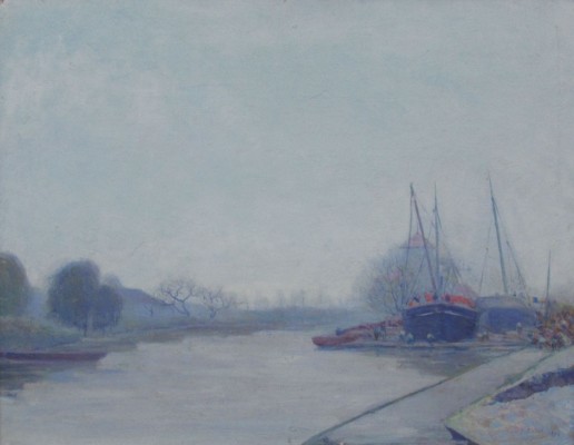 Fechada en 1924, la obra integra el conjunto de vistas de La Boca y la actividad portuaria de El Riachuelo, en el que al artista explora la representación de la atmósfera con grises de color, creando una imagen de tono romántico y literario.