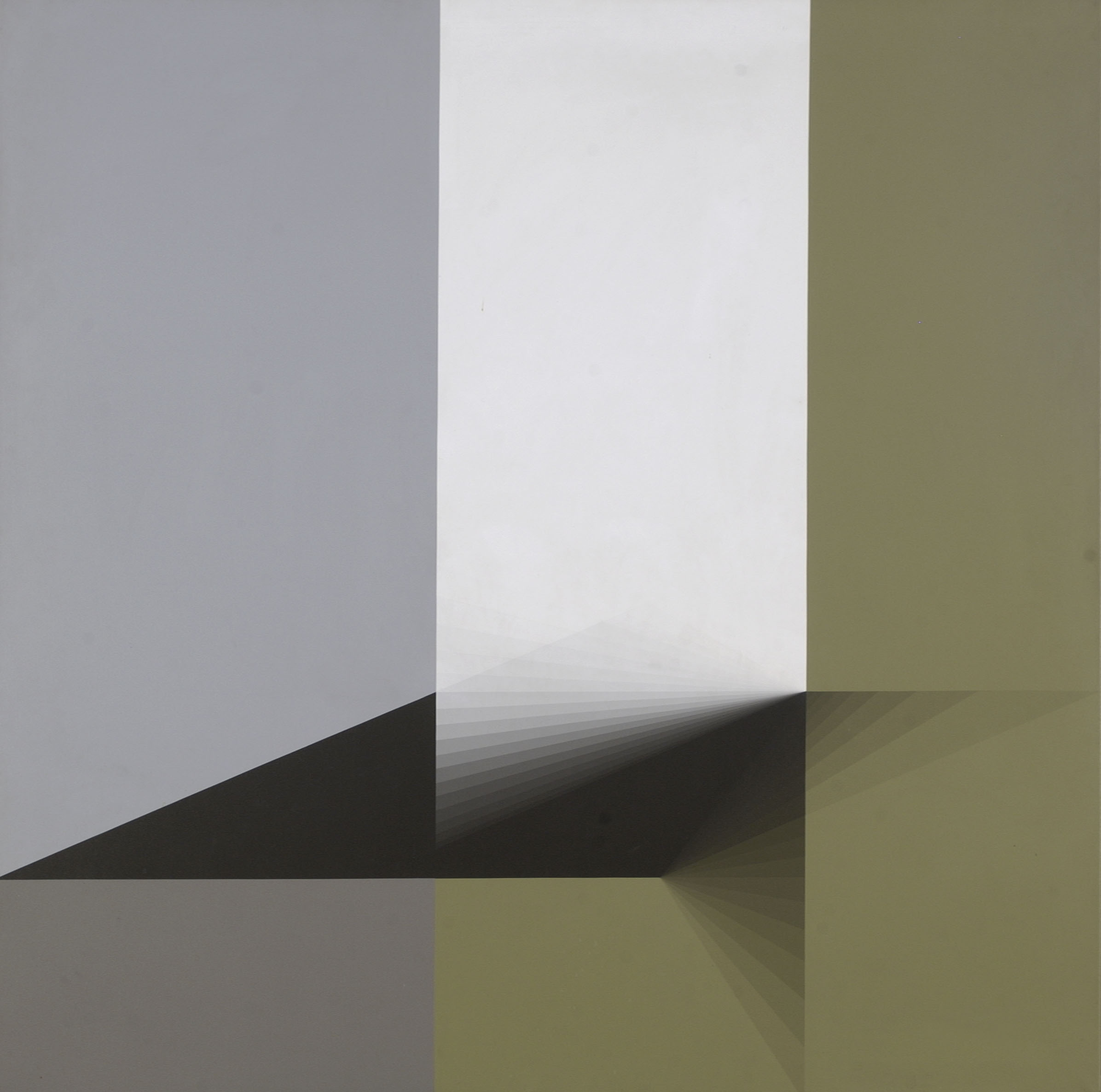 Construyó su obra en base a principios geométricos, indagando en el movimiento virtual de los planos de la imagen como consecuencia de las gradaciones de valor y color, realizadas con mínimos pasajes en el desplazamiento de líneas rectas en el fondo de la composición. En Sthenos VI, el triángulo negro de la izquierda se descompone y se volatiliza en rayos de luz que crean una percepción de movimiento en el ojo del espectador. Sólo trabaja con ocre, blanco y negro y con esta paleta reducida, trabaja las trasparencias y logra vibraciones en la superficie de la tela.