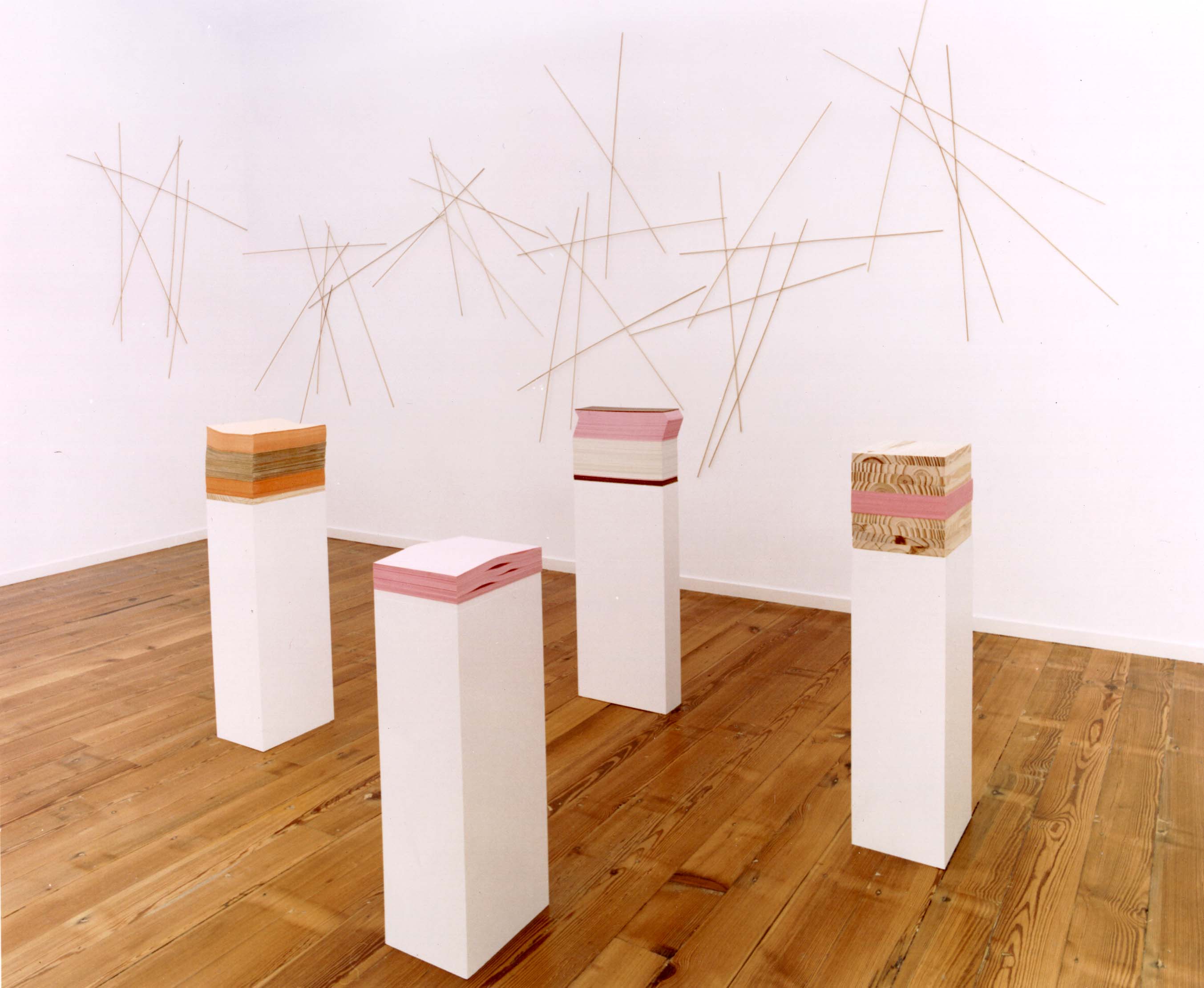 Se trata de una instalación en donde el espacio se puebla de objetos de distinta índole, entre los que se halla un mural hecho con largas varillas de madera. Tanto las construcciones realizadas a base de técnicas mixtas como aquella que elabora con varillas, evidencian un nuevo orden en donde el tiempo y el azar constituyen los parámetros de reconstrucción del objeto. Objeto de apariencia estable y preestablecida, que se modifica por la sola intervención del artista, quien metafóricamente dialoga con la realidad.