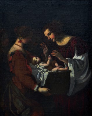 El asunto elegido por Vignali es el detallado en Éxodo 2,3-10. Moisés nació en la época en que un decreto real -del que no existen testimonios extrabíblicos- prescribía la muerte de los varones hebreos recién nacidos. Entonces fue arrojado a las aguas del río Nilo en una cesta, donde fue encontrado y salvado por la hija del faraón. Vignali le da un giro a la interpretación del asunto: focaliza su composición en la tensión de la mirada del niño y la hija del Faraón, innovando en la manera de representar el tema y soslayando referencias descriptivas tradicionales de la escena. La luz, dinámica, la resuelve con múltiples focos: acentúa el vínculo de las dos figuras principales y deja el rostro de la segunda mujer en penumbra, pero destaca su cuello y hombros con sensualidad. En el fondo, apenas se adivinan otros personajes. La elegancia depurada de su estilo acuerda con el clásico refinamiento de la corte de los Médicis durante el seiscientos florentino.