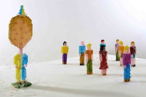 “Su producción tiene inicio en la década del 90. Momento en el que se formulan alternativas estéticas que determinan debates en el campo del arte. Los materiales brillantes y excesivamente decorativos, los elementos banales, las formas seductoras, lo kitsch, determinan a una de las tendencias, en la que Vitali se postula como uno de los artistas representativos. “En los primeros años de su inserción en el medio, desarrolla su producción a partir de objetos e instalaciones que combinan caracoles, flores, toallas, luces, tierra, cuentas acrílicas, pegamentos y cables.”[1] Hacia la mitad del decenio, su obra adquiere rasgos particulares, caracterizándose por el rescate de una técnica manual desarrollada en la década del 70, un sistema de tejido realizado a partir de cuentas acrílicas facetadas. De este modo, el autor crea un repertorio compuesto de estructuras geométricas, lumínicas, y ecosistemas naturales y escenas domésticas. Todas ellas regidas por la lógica de las “relaciones”.