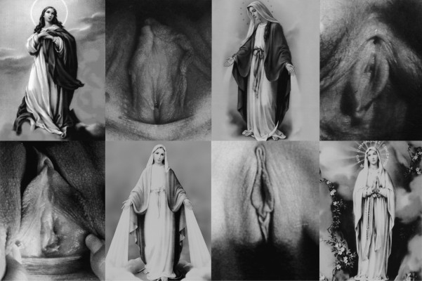 Reunidas por pares según semejanzas formales, imágenes de vírgenes —extraídas de estampitas compradas en santerías— y de vulvas —seleccionadas de revistas pornográficas— se alternan en la composición, configurando este fotomontaje a modo de mosaico.