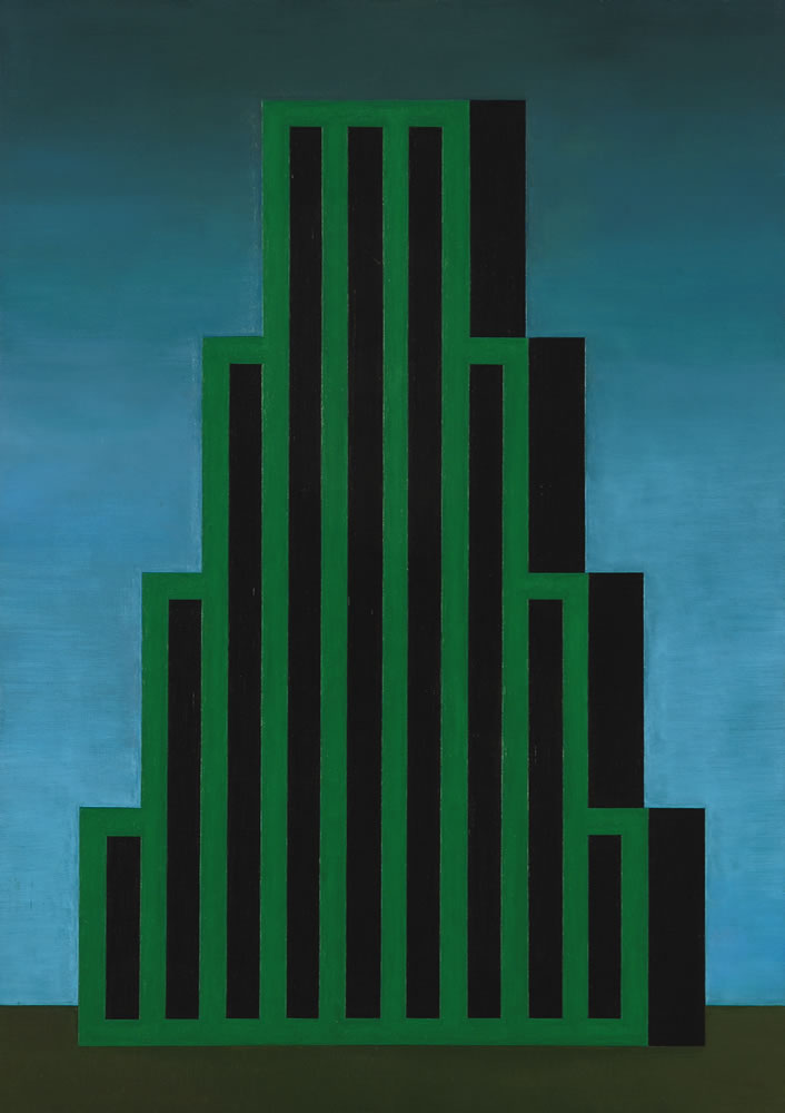 En este contexto se halla la obra de la colección castagnino+macro que pertenece a un período de producción desarrollado en los años 90. Luego de una serie de arlequines y de su incursión por la serigrafía, la ironía de los títulos cede el paso a la insistencia en otros rasgos. Sus obras se tornaron más herméticas y despojadas en las que el artista ensayó un repertorio iconográfico a partir de torres y monumentos envueltos en atmosferas surreales, empleando una geometría más acentuada donde profundizó las relaciones entre los tintes y en el juego figura- fondo. Tal es el caso de Torre, entidad ambigua dada su precisión formal.