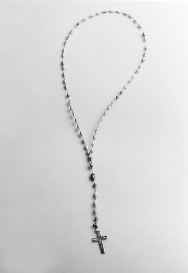 Siguiendo esta línea, empieza a utilizar, como medio, cuentas de papel fotocopiado con los listados de desaparecidos, para construir objetos que “conllevan idénticas proporciones de horror y belleza poética”. (2) El Rosario, que forma parte de la colección, se halla suspendido en el espacio que lo contiene. Como todas sus obras colgantes, es “la materialización de un pathos extremo que remite, en clave alegórica, a una memoria de los cuerpos ausentes”. (3)
