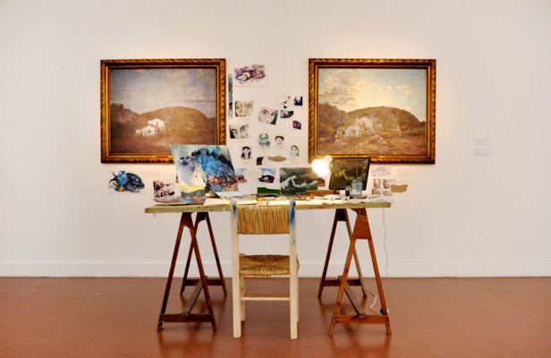 Dibujos, textos, papeles, libros, diarios de investigaciones y una sentida carta dirigida a la institución, a modo de homenaje a Fader, se despliegan sobre una mesa frente a ambas piezas, bajo la tenue luz de un velador. Escena que recrea poéticamente la atmósfera de atelier, donde Gómez trascurriera sus días intentando reconstruir una y otra vez aquel supuesto paisaje entre “la nochecitay el amanecer.”