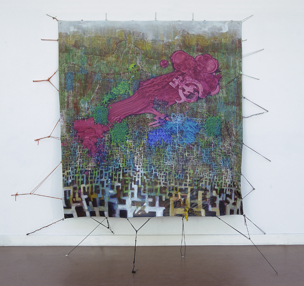 Montado con cuerdas sujetadas al muro y al piso, este lienzo deja ver las texturas de las arpilleras, las pinceladas, los goteos, la espesura y fluidificación de la materia, y la explosión del color. Elementos que forman parte de este universo del artista donde todo está en permanente ebullición.(2)