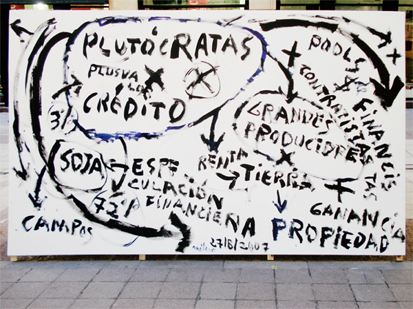 En esta obra de formato rectangular, compuesta por dos bastidores intervenidos, se leen escrituras relacionadas al conflicto sobre el financiamiento agropecuario en Argentina. Intervención pictórica consecuencia de la performance realizada el 27 de agosto de 2007, en la esquina de calle Córdoba y Corrientes, frente a la Bolsa de Comercio de Rosario. Acción que contó con el auspicio del museo Castagnino+macro y la galería Marasca Trip de Rosario.