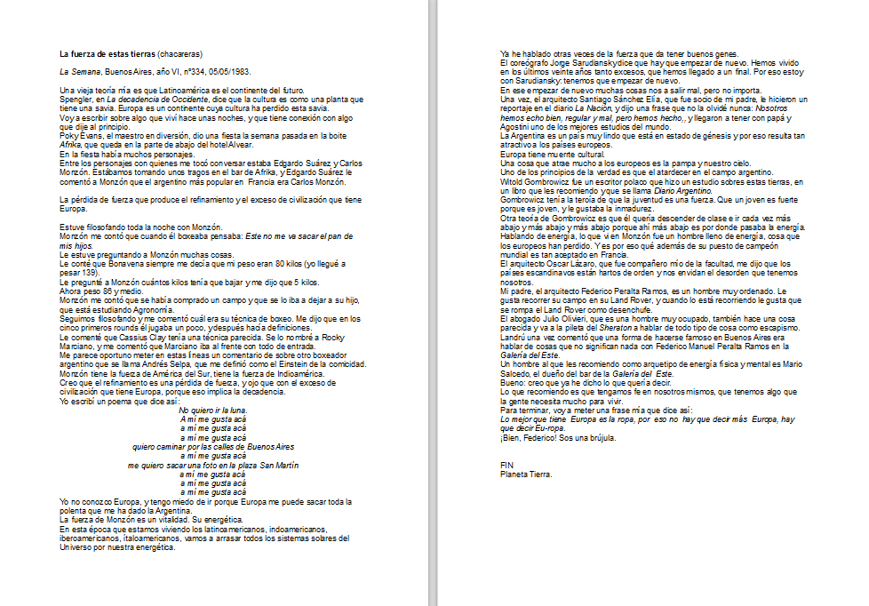 Asimismo, escribió artículos para la revista La Semana de Buenos Aires. Reclamo de supervivencia (merengue) de 1982; Polleras (foxtrot); y La fuerza de estas tierras (chacareras) —ambos de 1983— son algunos de ellos. Allí, Federico Manuel Peralta Ramos plasmó con humor, lucidez y creatividad tantas vivencias y anécdotas personales como su idea y visión acerca de diversos temas tales como las mujeres, la creación del universo y el arte.