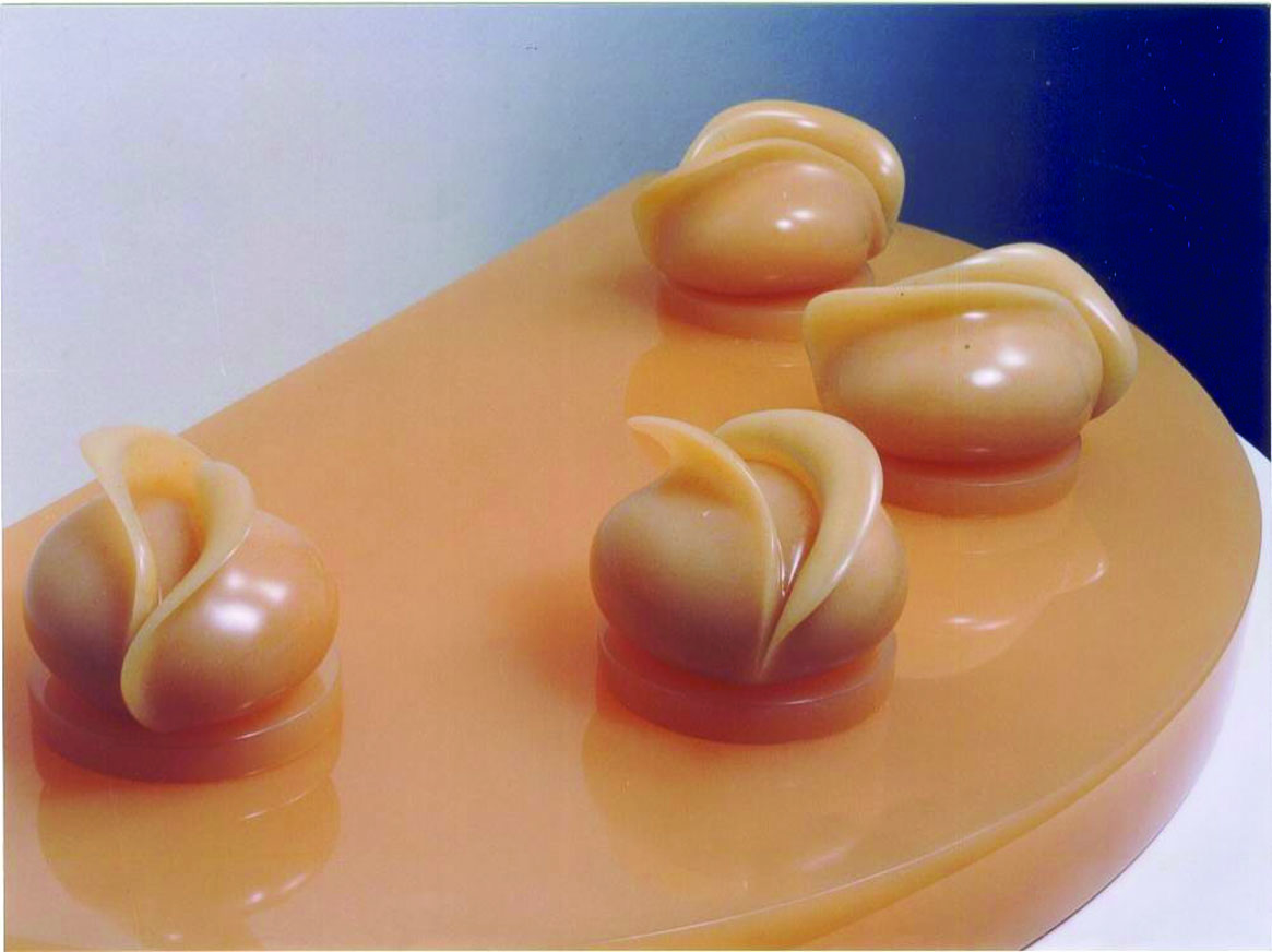 La ausencia de la huella manual, la factura y pulcritud de los acabados son factores que, además, colocan esta producción de Acevedo en el límite de la frivolidad típica de los objetos y diseños de consumo realizados por la industria. No obstante, el carácter utilitario y ornamental es sólo una apariencia ya que su estética excede los planteos puramente formales para formular, desde los mismos lenguajes preciosistas, una crítica hacia las estéticas, cánones y gustos impuestos por el mercado. Problemática trabajada en una serie de obras anterior, de gran brillo y de pliegues aterciopelados semejantes a objetos de vidriera.