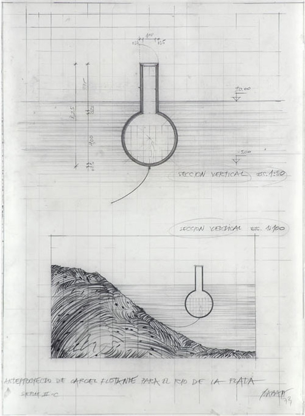 En la década del 70, el gestor y crítico de arte Jorge Glusberg –entonces director del Centro de Arte y Comunicación (CAyC)– impulsó la producción de trabajos que reflexionaran sobre la particular situación de América Latina signada por profundas crisis sociales y dictaduras militares. En este contexto, en 1973 Zabala presentó la muestra Anteproyectos, en el CAyC. Fotografías, catografías, ready-mades, textos, instalaciones, etc. integraron la misma. A este vasto cuerpo de obras pertenecen los Anteproyectos de arquitectura carcelaria latinoamericana para artistas en los que se halla esta obra de la colección Castagnino+macro. Sobre el papel calco, el dibujo técnico del lenguaje arquitectónico se hace presente en vistas y plantas de estrechos receptáculos individuales. En esta ocasión, el corte a escala de una cárcel flotante para artistas sobre el Río de la Plata. Esta obra, junto con otras dos piezas de su proyecto carcelario que también forman parte de este acervo, ponen en foco problemáticas constantes trabajadas por Zabala en su producción. Por un lado, evidencian tanto el autoritarismo y el carácter represivo de los gobiernos latinoamericanos de la época como el aislamiento contextual en los que podían encontrarse los artistas. Por el otro, marca “la necesidad de reflexionar sobre el tipo de arte necesario para contrarrestar los efectos de cualquier domesticación.” (1)