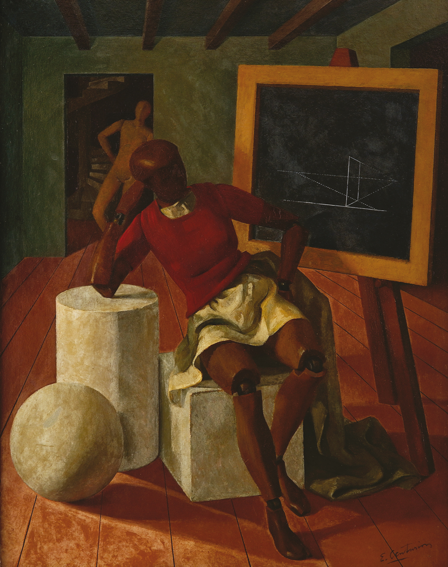 Geometría llegó al Museo Castagnino+Macro en 1945. Un año antes, había participado de la muestra La Pintura Argentina desde el Centenario. 1911-1943 realizada en el Salón Peuser con artistas premiados en el Salón Nacional de Buenos Aires. Vale aclarar que la obra se expuso en la etapa en que comenzaban a hacerse visibles las versiones vernáculas de las corrientes geométricas no figurativas y nuestra pintura, parece encarnar una metáfora de su avance en el taller del artista. Centurión estructura el espacio con una aguda perspectiva y define las figuras con un dibujo sólido, con una concepción metafísica que puede ponerse en relación con Muñeco (1934), expuesta en el 25º Salón Nacional.