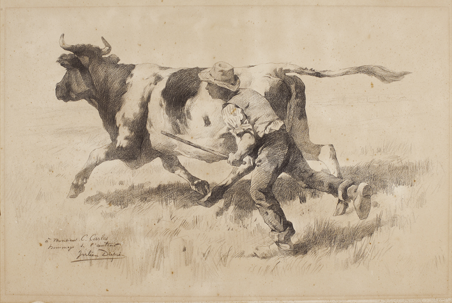 Muchacho corriendo una vaca puede ponerse en relación con el óleo sobre tela La vache echapée que pertenece a la colección del Museo D´Orsay y que se expone desde 1956 en el museo de Dunkerke, Francia. El modo de ingreso de este óleo a las colecciones nacionales francesas es desconocido, pero se presume fue adquirido por el Estado en el Salón de la Sociedad de Artistas Franceses de 1885, donde fue exhibido, y mas tarde destinado al Museo del Louvre. Es posible arriesgar que la obra del museo Castagnino es un dibujo preparatorio para la pintura citada, en la que cada detalle del estudio del motivo principal ha sido conservado sin modificaciones. Este hecho nos permite datar nuestro dibujo en los años próximos anteriores a esa fecha. Dupre ha finalizado la tela con la realización del paisaje del fondo -seguramente imaginario, como en la mayoría de sus trabajos, e inspirado en la campagne picarde, región de Saint-Quentin y Nauroy- y con la inclusión de más animales en el fondo.
