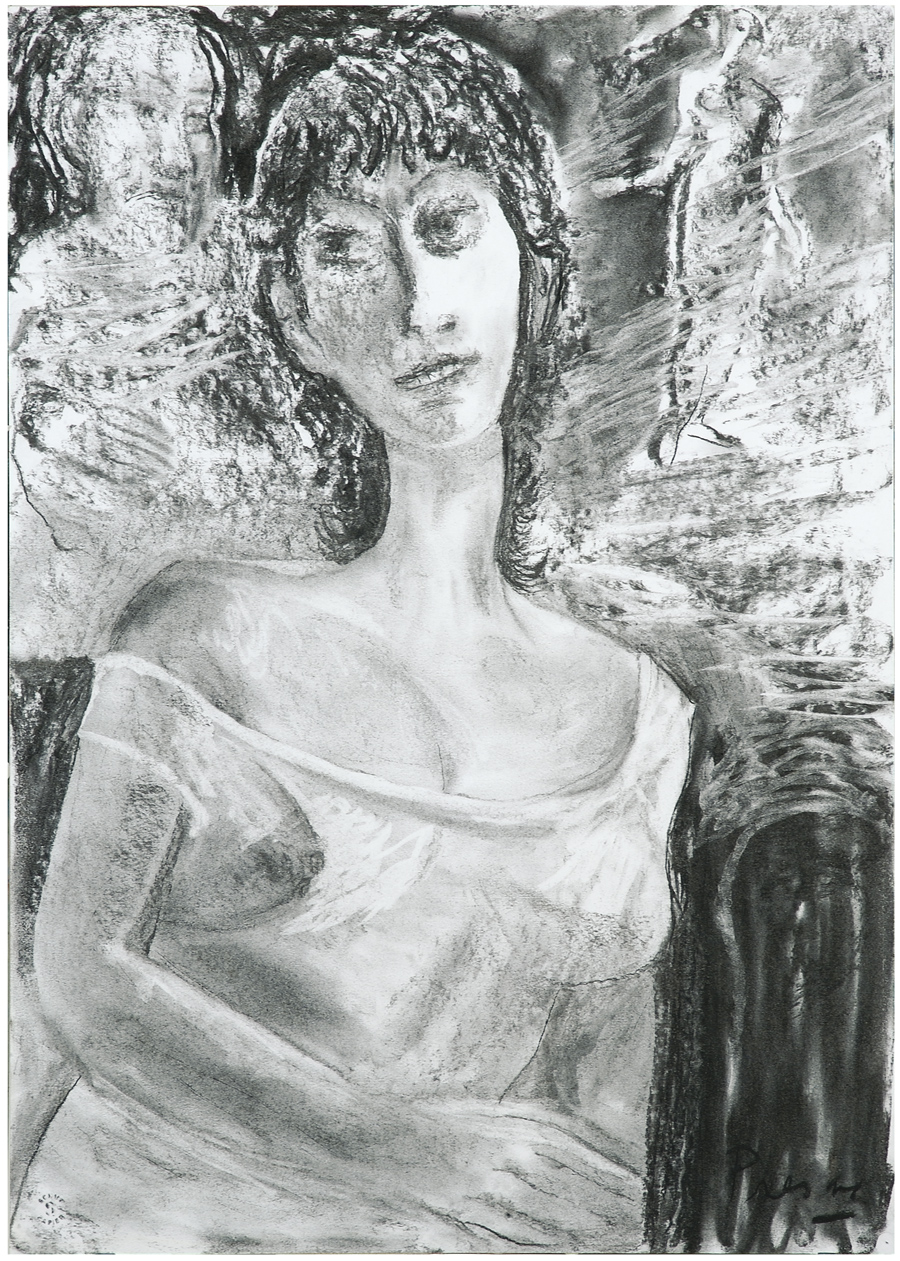 En sin título, el dibujo que nos ocupa realizado a la carbonilla, es posible advertir que las características del lenguaje de las pinturas han sido transpuestas a la obra gráfica sin alterar el tono de su estética. Presas representa una figura de mujer -uno de sus temas preferidos- en el que desarrolla su concepto de belleza femenina en clave de ondulaciones y curvas que alteran el cuerpo, especialmente el cuello, los brazos y el torso, generando una imagen sensual y poética, ajena a la realidad. También aparecen otras imágenes que parecen levitar sobre nuestra retratada, un rostro masculino y una figura femenina que ganan corporeidad entre los trazos con los que el artista compone el fondo de la composición.