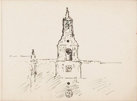Arcada de la plaza y torre de la Compañía, es elúnico dibujo del cuaderno que lleva su firma y que ha sido fechado el 29 de enero de 1952. Con una particular manera de componer, esbozando, perfila uno de los arcos de la Plaza de Armas y enmarca un edificio que resuelve con mayor definición y que es posible identificar con la Iglesia de la Compañía de Jesús, construida entre los años 1595 y 1698. El mismo recurso compositivo utilizará en sin título [reg. 3124], dibujo en el que, utilizando lápices de colores, crea una atmósfera en extremo sensible lograda a la vez por la sutil sugerencia de la imagen  y por el carácter inquieto de sus trazos amarillos, rojos y azules que esboza con rapidez y afianzan su gesto. Es posible destacar que éste y Mar y Arena son representaciones que han cobrado autonomía respecto de sus posibles modelos, en ellos Victorica se acerca al lenguaje abstracto en clave más bien lírica y esta condición los diferencia del resto del cuaderno.