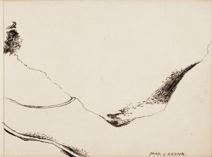 El paisaje es probablemente el género mas cultivado por Victorica a lo largo de su carrera (1). Las vistas obtenidas en ciudades europeas, americanas y del interior del país, realizadas con un estilo abocetado pero con una profunda capacidad de expresión, son el fruto del estímulo de los viajes que despiertan su imaginación y sensibilidad (2). Unos pocos años antes de su muerte, Victorica realizó dos viajes fuera del país que dejaron huella en su producción: en 1952 recorrió Bolivia y Perú y en 1953 regresó a Italia. Cartas con dibujos de paisajes de La Paz enviadas desde esta ciudad en enero de 1952 (3) anteceden la realización de un cuaderno de viaje en Arequipa, hoy en la colección del Museo Castagnino. Probablemente adquirido en alguna de las ciudades visitadas, el cuaderno posee dos tapas de cuero grabado con imágenes tradicionales y folclóricas y conserva nueve dibujos fechados entre fines de enero y principios de febrero de 1952. En una de las tapas se hallaba adherida una etiqueta de la galería Witcomb, que en el reverso posee el precio de base del lote -7500 pesos- que corresponde al remate de la sucesión.