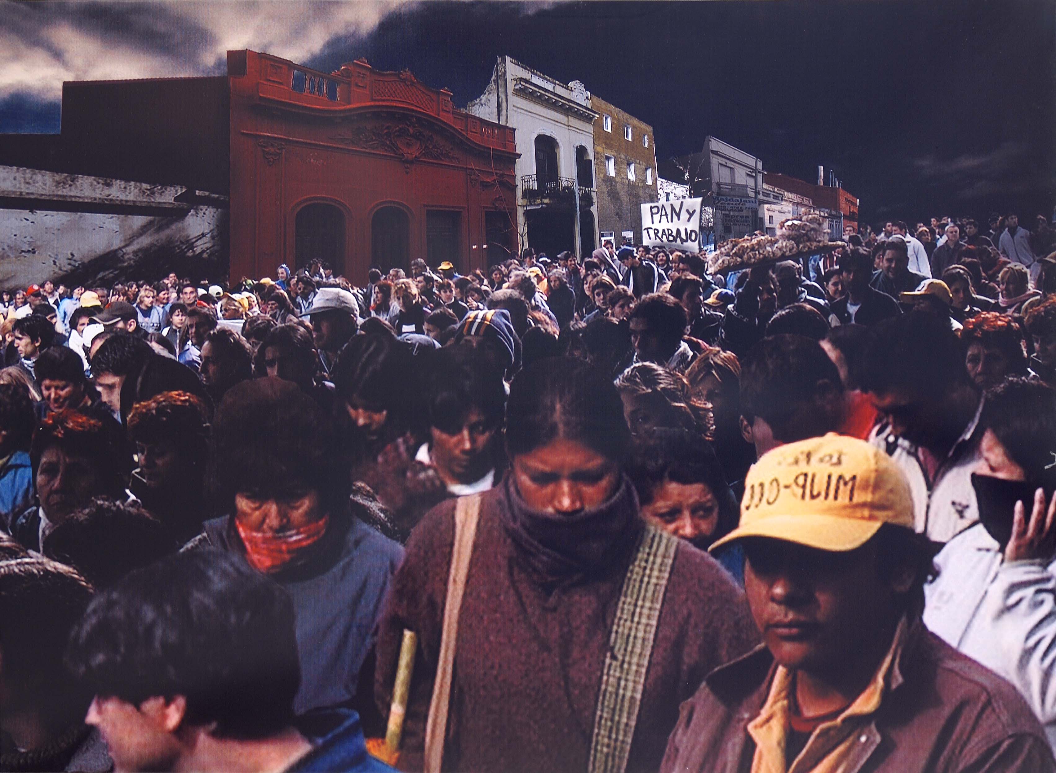 En esta obra el autor condensa sus preocupaciones y reflexiones acerca de la representación visual tomando como mecanismo de creación la cita pictórica. La referencia es a una obra de Antonio Berni titulada Manifestación, de 1934. Pieza considerada como fundacional del Nuevo Realismo, con el que Berni, propuso renovar la experiencia visual: nuevas formas, materialidades y estrecho vínculo del artista con los acontecimientos políticos y sociales del momento. En la imagen actual aparecen actores sociales in-visibilizados —desocupados, excluidos y nuevos pobres— vinculados a las protestas sociales de la Argentina de principios del 2000.