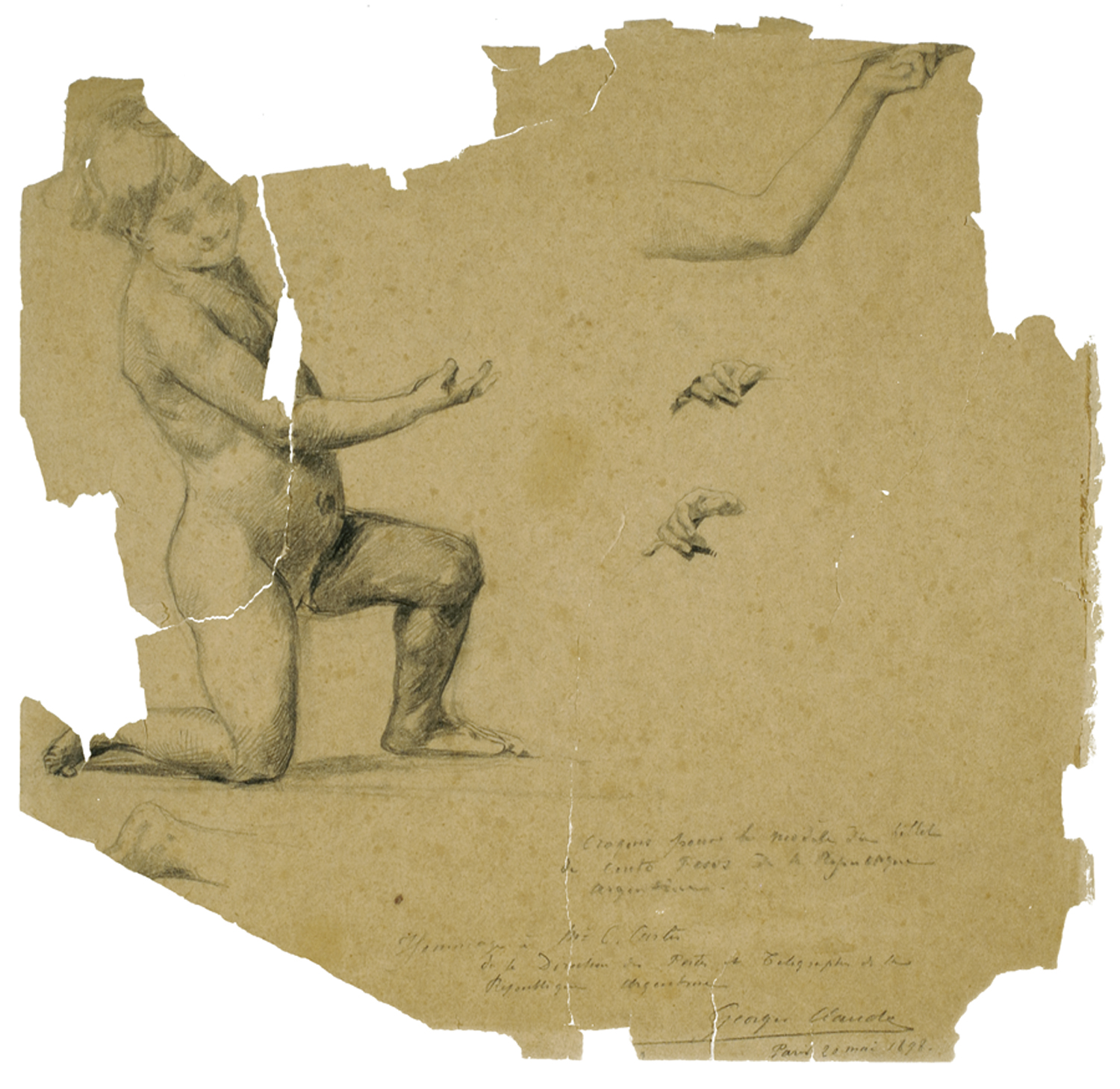 Del conjunto de tres bocetos, dos de ellos han sido firmados en Paris el 20 de mayo de 1898 y dedicados al donante mientras ocupaba el cargo político de Director General de Correos y Telégrafos de la República Argentina. En estos dos croquis, como los llama el artista, aparecen estudios de figuras que integrarían el grupo alegórico que se observa en el tercer trabajo [reg. 419]. En este último, que no posee ni dedicatoria ni fecha de ejecución, el formato del billete ya es evidente. A la izquierda aparecen dos putti o personajes infantiles alados sosteniendo un óvalo que incluiría un retrato y una figura femenina alada y con trompeta, probablemente una representación de la Fama, que es quien acompaña a muertos ilustres o se la suele asociar a personajes históricos, como el que seguramente se incluiría en el retrato. En el borde superior es posible leer dentro de una viñeta República Argentina 1000. Allí también se observa el escudo nacional y dibujos a la derecha que se han perdido por rasgaduras que ha sufrido el soporte de papel. El artista especifica en el texto de su dedicatoria que se trata de croquis para modelo de billetes de cien pesos de la República Argentina.