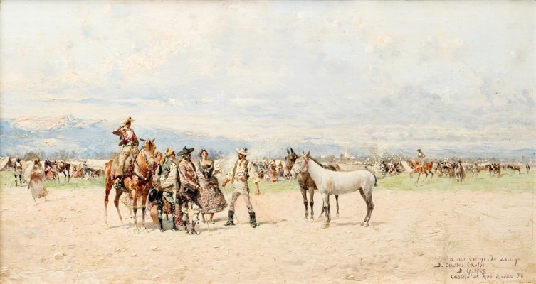 Seguidor en sus primeras épocas del costumbrismo romántico de los pintores españoles castellanos, en Italia desarrolló una pintura exuberante en el uso del color influenciado por los luminaristas Edoardo Dalbono y Francesco Paolo Michetti. Se convirtió en uno de los más fieles admiradores de Mariano Fortuny y a  comienzos de 1880 pintó sus primeros óleos con motivos de gitanos y caballos engalanados andaluces que luego identificarán su vasta producción. Mas tarde comenzó su interés por un paisajismo más austero y de connotaciones naturalistas que defendían Achille Vertunni y los pintores de la campagna romana. Otra vez en Barcelona adhirió al realismo costumbrista de rasgos pintoresquistas y se centró en un ambicioso proyecto que llamó España Pintoresca, pero que no pudo materializarse en el transcurso de la vida del pintor. Aspiraba a plasmar la riqueza y diversidad de las costumbres típicas y tradiciones de las regiones españolas documentándose con infinidad de estudios y bocetos que recopilaba durante sus viajes por el país. Inspirado en cantares y romances populares, pintó procesiones, fiestas y escenas que daban cuenta del espíritu popular Estos apuntes de gran carga expresiva y espontaneidad fueron influenciados por la obra de Adolf Menzel, que había impactado notablemente a nuestro artista en la exposición de Paris de 1885.