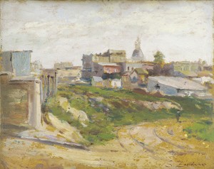 De estos primeros años en Rosario, dos óleos sobre cartón aparentemente pintados al año siguiente de su llegada –han sido fechados en el libro de registro de la colección del Museo Castagnino+macro como de 189015– documentan su trabajo a plein air. Son dos apuntes de vistas de la ciudad desde la bajada Belgrano, cuyas medidas de soporte y técnica pictórica perdurarán en cantidad de bocetos realizados desde esta fecha y durante sus años de actividad posteriores. Estas dos obras de pequeño formato expresan su formación en el lenguaje artístico ottocentista y su persistencia y comunión con las enseñanzas y el espíritu de su formación genovesa.