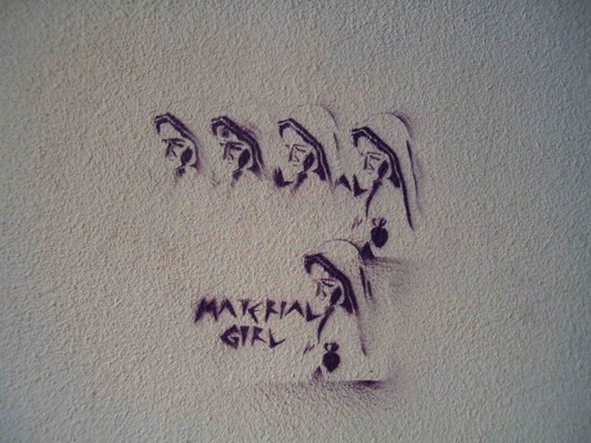 En estas piezas las imágenes recreadas surgen de la cultura popular y la vida cotidiana de entonces. En Material Girl la referencia es a una canción de Madonna de los 80 y a las apariciones de la Virgen que provocaron diversas reacciones por parte de la comunidad mendocina —rezos, procesiones y repercusiones mediáticas—. En el otro esténcil utiliza la reconocida imagen infantil del Pequeño Pony al que le añade en el anca el dibujo de una pastilla. Cutie-Mark se denomina al símbolo que les aparece a los pony en una de sus patas al encontrar su destino.