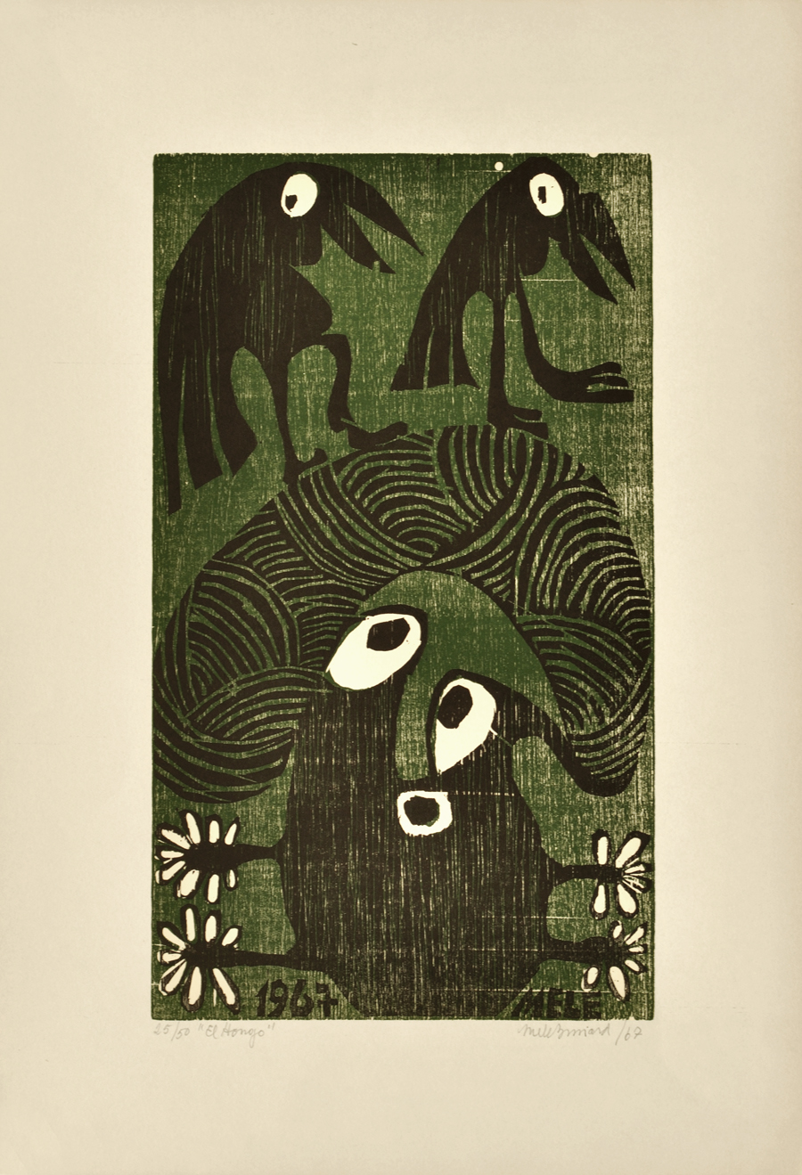 Muchas de las características visualizadas en esta estampa también pueden rastrearse en otras obras que integran el acervo del Museo, tales como: Los amigos, Los compadres, Cocorococó, Solarium, Símbolo y Jarabe de pico. Todas ellas incluidas en la carpeta Siete xilografías originales Mele Bruniard, de 1967.