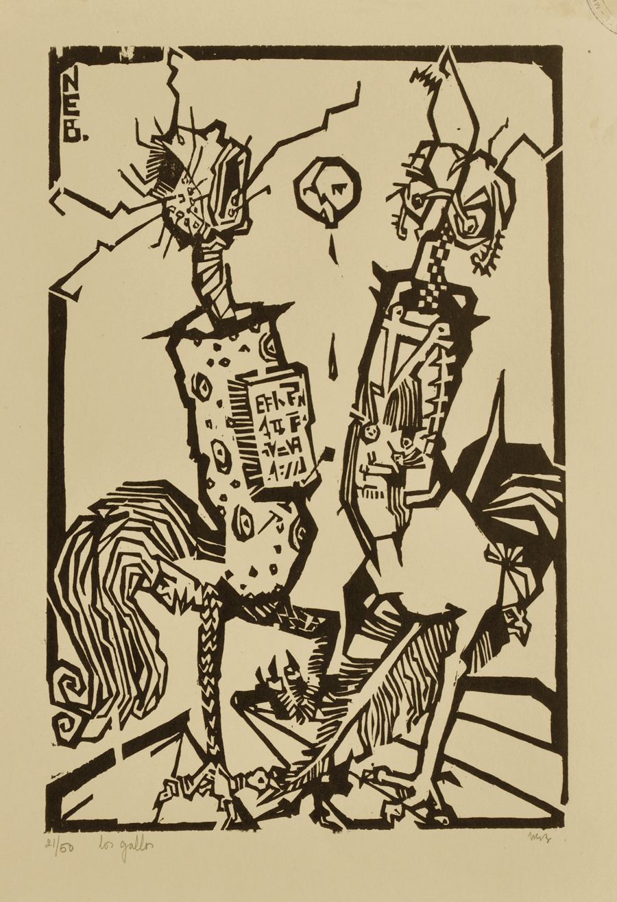 Al igual que esta pieza titulada Los gallos, las xilografías incluidas en ambas publicaciones, revelan cierta influencia del estilo expresionista alemán. Emplea líneas irregulares, contornos perfilados y planos con estrías o diagonales. Imágenes que demuestran dolor, tristeza, angustia, etc.
