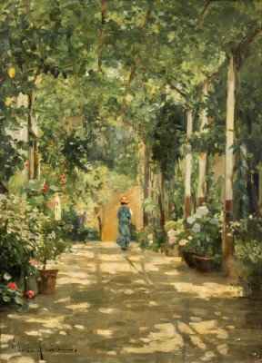 Paisaje se caracteriza por la luz y la profundidad generada por una perspectiva central. Las manchas de luz en el suelo, logradas por pinceladas de ocres luminosos y la paleta de colores cálidos que describe los efectos de la luz en el jardín a través de toques de pincel, relacionan la intención del artista con la de los pintores luminaristas europeos de la segunda mitad de siglo XIX, especialmente con los macchiaoioli italianos.