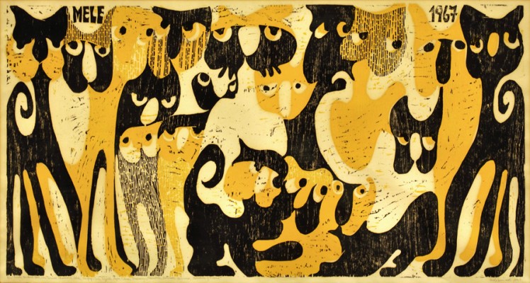Tal es el caso de esta xilografía de 1967 en la que representa a un conjunto de gatos. La imagen fue trabajada respetando la naturaleza sensible del material: se visualizan tramas lineales y texturas de la madera; a la vez, recurrió al contraste de color para generar las siluetas de los protagonistas. Estrategias exploradas con la intención de una revalorización expresiva de la imagen xilográfica.