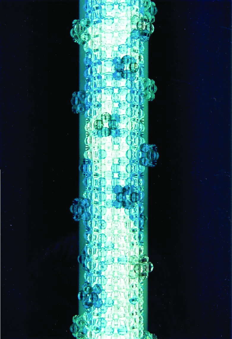 “Su producción tiene inicio en la década del 90. Momento en el que se formulan alternativas estéticas que determinan debates en el campo del arte. Los materiales brillantes y excesivamente decorativos, los elementos banales, las formas seductoras, lo kitsch, determinan a una de las tendencias, en la que Vitali se postula como uno de los artistas representativos. “En los primeros años de su inserción en el medio, desarrolla su producción a partir de objetos e instalaciones que combinan caracoles, flores, toallas, luces, tierra, cuentas acrílicas, pegamentos y cables.”[1] Hacia la mitad del decenio, su obra adquiere rasgos particulares, caracterizándose por el rescate de una técnica manual desarrollada en la década del 70, un sistema de tejido realizado a partir de cuentas acrílicas facetadas. De este modo, el autor crea un repertorio compuesto de estructuras geométricas, lumínicas, y ecosistemas naturales y escenas domésticas. Todas ellas regidas por la lógica de las “relaciones”.
