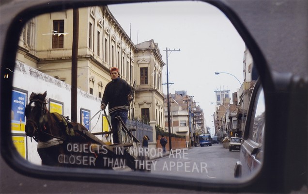 A este conjunto pertenece la fotografía de la colección Castagnino+Macro que plasma una vista habitual entonces, capturada desde el espejo retrovisor de un vehículo. Signo de desempleo y formas laborales precarias. Con una resignificación de la universal leyenda automovilística Objects in mirror are closer than they appear, la autora puso en evidencia una situación cotidiana que, aunque muchos ciudadanos y autoridades intentaban ignorar, estaba allí presente, “más cerca de lo que se creía” o de lo que se quería creer. Práctica que perdura en la actualidad.