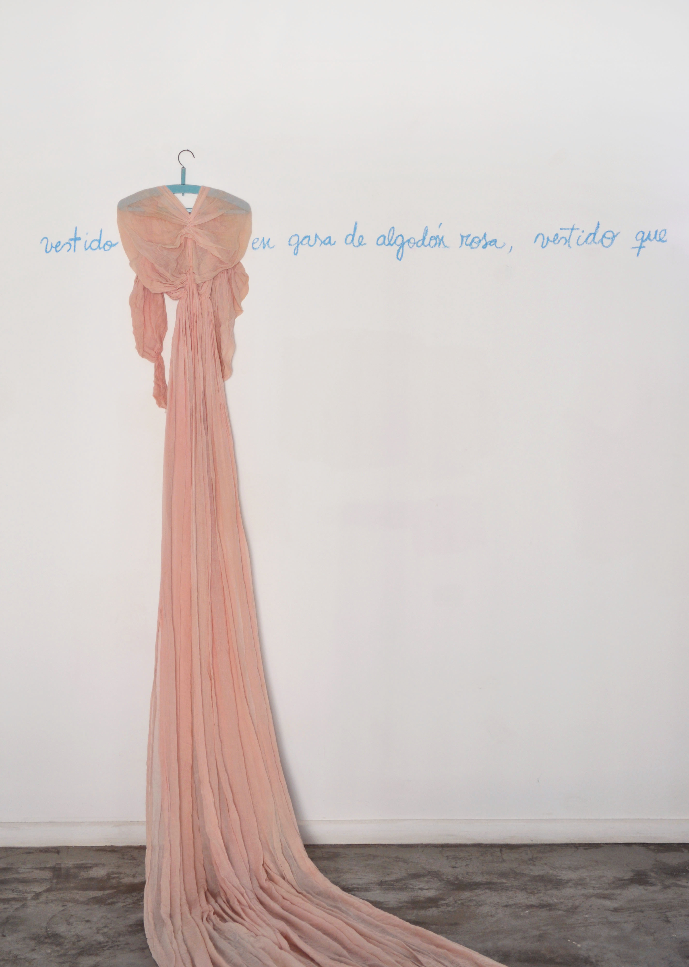 Vestido rosa, perteneciente a la Colección Castagnino+Macro, es presentada por primera vez en el año 2002 en la galería Arcimboldo de Buenos Aires. Se trata de una instalación en donde dispone una prenda de más de 10 metros de largo acompañada del texto manuscrito que dice: “vestido en gasa de algodón rosa, vestido que alude a otros perdidos para siempre, ausencia de cuerpo que no acepta, amor a pesar de todo. Amor”.
