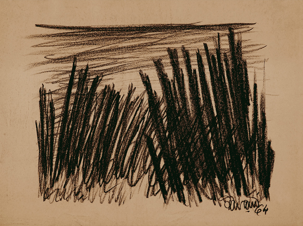 El “grafismo” siguió presente entre las preocupaciones de Favario durante los años que siguieron. El viaje a Europa lo pondría en contacto directo con la obra de expresionistas e informalistas, especialmente a través de la muestra Art USA Now. The Johnson Collection of Contemporary American Paintings (Musée d'Art Moderne, París, 1964) del que dejó habida cuenta en sus escritos. Este acercamiento a la pintura contemporánea actuó como reaseguro para el rumbo que tomaría su producción. Basta echar una mirada a la gráfica que acompañó a Pinturas de Eduardo Favario (Galería El Taller, Rosario, 1965) -la muestra que realizó a su regreso al país - para dar cuenta de las dimensiones de ese impacto. Sin Título (1964) y Sin Título (s/f) pueden ser vistos como testigos de este primer cambio. Ambas carbonillas fueron incluidas en la muestra homenaje al artista, realizada en las Galerías del Centro Cultural Parque de España (Rosario, septiembre de 1999).