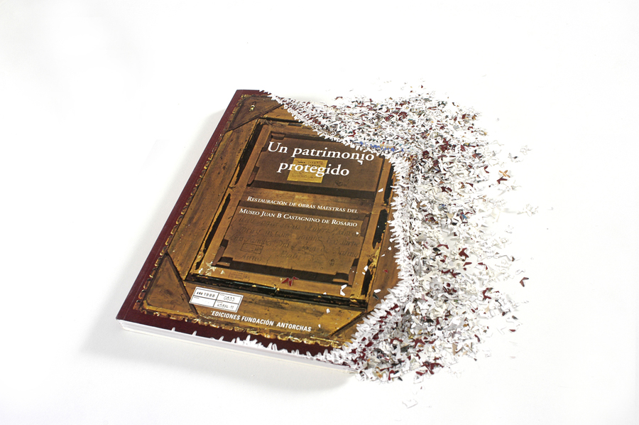 En Un Patrimonio Protegido, el artista pica los bordes del libro en pequeños pedacitos. Esta acción busca subrayar las obligaciones que los museos tienen de proteger y cuidar el patrimonio artístico que se les confió a través de donaciones y adquisiciones.