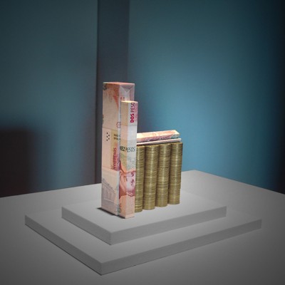 Para su armado utilizó pilas de monedas con las que construyó los cilindros del silo que se utlizaban anteriormente y billetes doblados con los que dio forma a la estructura que, desde entonces, integra su patrimonio.