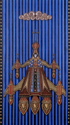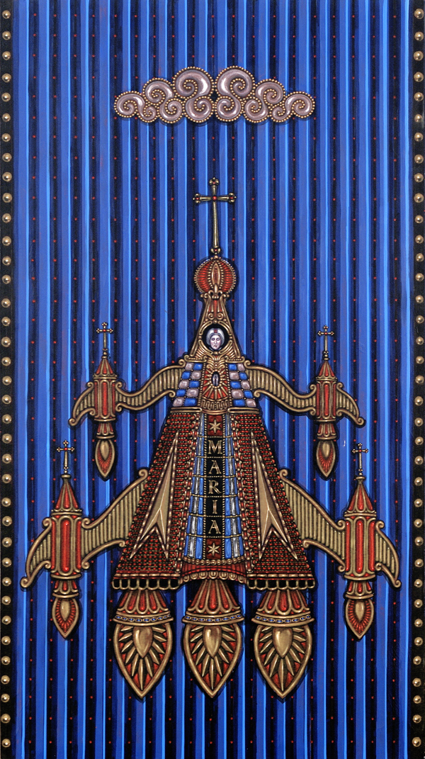“Sobre un espacio rayado de azules, la silueta de un cohete engarzado asciende solemne. El rostro de la reina de los cielos – con casco- asoma de su traje espacial de dorada y roja bijou (...) El relato de la asunción de la nave María es lanzado a lo ficcional por una mente infantil donde la virgen astronauta no vuela, sino que levita con gravedad mántrica (...) Se construye una escena que recuerda en cada pincelada que el arte y la religión omiten a menudo en sus prácticas a la virtud del buen humor”. (1)