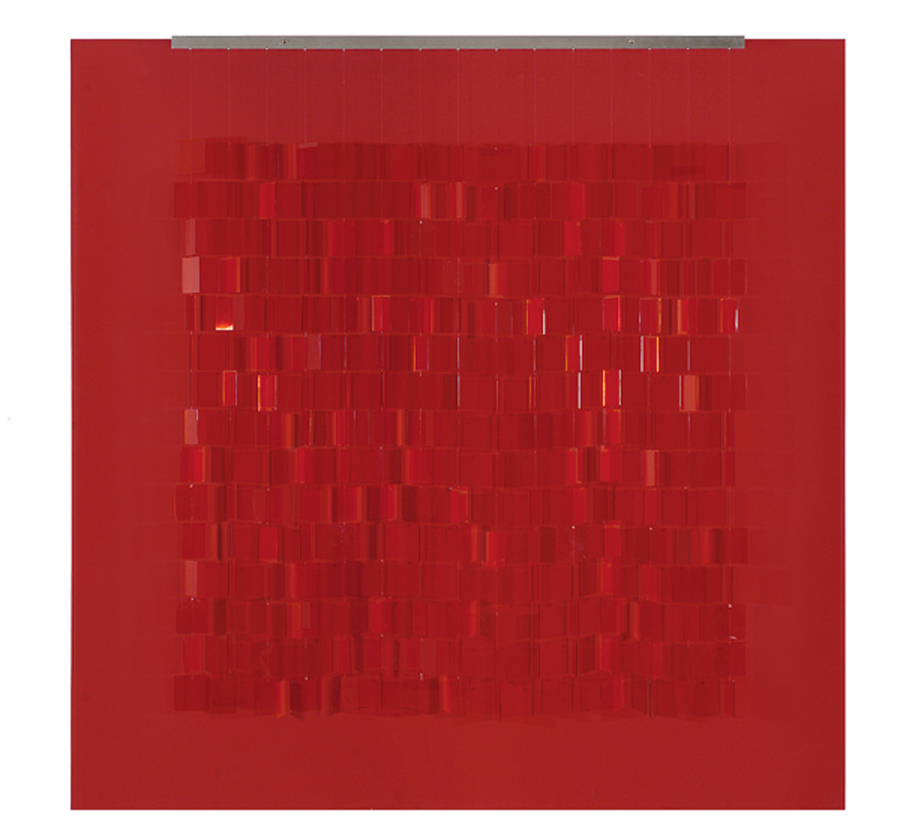 La obra que integra la colección Castagnino/macro constituye una síntesis entre el espacio pictórico y el campo del objeto móvil. El movimiento de los módulos transparentes coloreados que aparecen suspendidos, junto con la luminosidad que incide sobre los mismos, generan un juego óptico de reflexión y refracción del entorno.