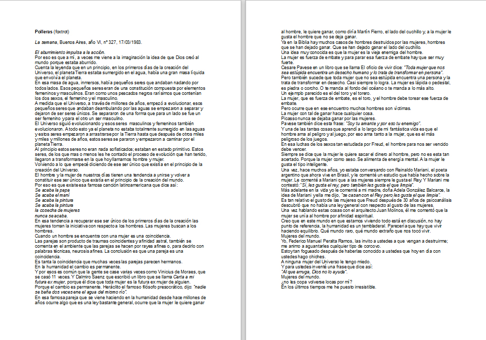 Asimismo, escribió artículos para la revista La Semana de Buenos Aires. Reclamo de supervivencia (merengue) de 1982; Polleras (foxtrot); y La fuerza de estas tierras (chacareras) —ambos de 1983— son algunos de ellos. Allí, Federico Manuel Peralta Ramos plasmó con humor, lucidez y creatividad tantas vivencias y anécdotas personales como su idea y visión acerca de diversos temas tales como las mujeres, la creación del universo y el arte.