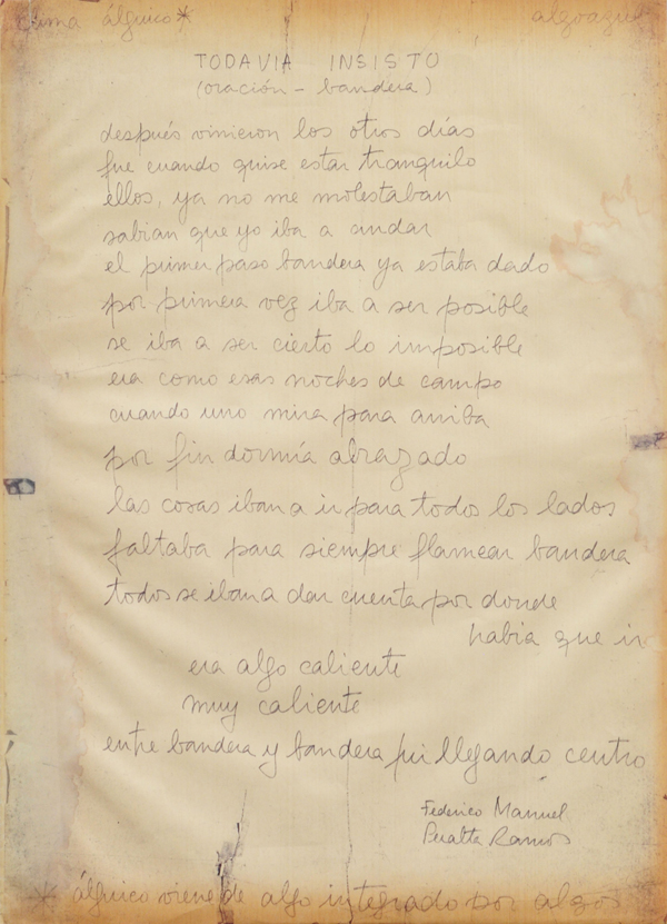 después vinieron los otros días / fue cuando quise estar tranquilo / ellos, ya no me molestaban / sabían que yo iba a andar / el primer paso bandera ya estaba dado / por primera vez iba a ser posible / se iba a ser cierto lo imposible / era como esas noches de campo / cuando uno mira para arriba / por fin dormía abrazado / las cosas iban a ir para todos los lados / faltaba para siempre flamear bandera / todos se iban a dar cuenta por donde había que ir / era algo caliente / muy caliente / entre bandera y bandera fui llegando centro