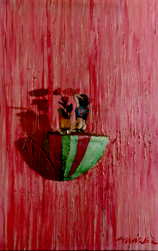 Luego de un período de no producción, en los años ochenta y noventa sigue conservando esa tendencia a desplazarse de los lugares asignados. La parodia y la cita se convierten en dos de los mecanismos de producción estética frecuentes en sus instalaciones, objetos y esculturas. Estos sostienen una narrativa conceptual, tendiente a “poner al espectador en el inquietante trance de verse reflejado y encontrarse seducido por la obra, real en su materialidad”. (1) Es posible ver este aspecto en la obra Rosa de lejos, de 1987, perteneciente a la Colección de arte contemporáneo de Rosario. Allí, el autor representa a uno de sus personajes en el marco de una escena común, que, por la forma en que está construida, pone en ridículo la situación representada. La ironía queda subrayada con el título de la obra que proviene de una telenovela, la cual, en ese marco, funciona como una referencia social de la época. Iniciativa que conduce a remarcar que este artista apunta a “desenmascarar la realidad social de una época manipulada por la industria de la cultura”. (2) De esa manera, el autor pone a lo social en el eje de sus trabajos, mediante una estética realista en donde, como lo manifiesta El enemigo invisible (2001), logra hacer del grotesco un modelo de representación, que se asienta en un espacio intermedio entre la risa y el horror.